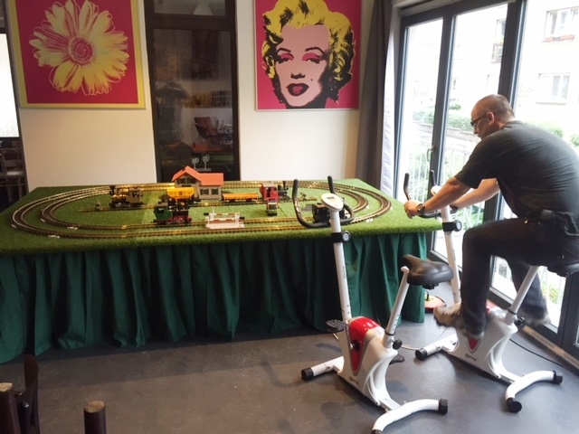 Na rozdíl od běžných vláčků zde nejsou diváci pasivními pozorovateli – právě jejich šlapání rozhýbe celý program. Mašinky o velikosti cca 30 × 20 cm projíždějí tratí o rozměru 3 × 1,4 m. Prostorová náročnost se navyšuje o místo pro dva rotopedy. Celý koncept je možné využít i jako soutěžní atrakci – měříme počet kol i čas.
